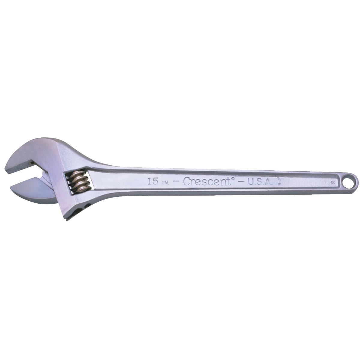 The original adjustable wrench, made by Crescent brand. Laser etched scale in both SAE Standard and Metric sizes allows easy identification. Larger knurl for easy adjustment ensures a tight jaw fit. Hex jaw design reduces slippage by stripping fasteners tightly. Tension spring stabilizes jaw and allows easy knurl adjustment. Heat treated forged alloy steel for toughness and durability. Chrome-plated finish wipes clean easily and resists rust and corrosion. Polished head and satin finished handle.
