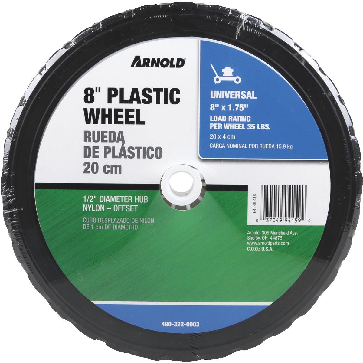 Inexpensive lightweight suited for equipment such as barbeque grills, small seed spreaders, hose reels, leaf bag carts and replacement for mowers. Wheels have a diamond tread, 1-3/8″ hub width, and 1/2″ nylon bearing. Poly hub.