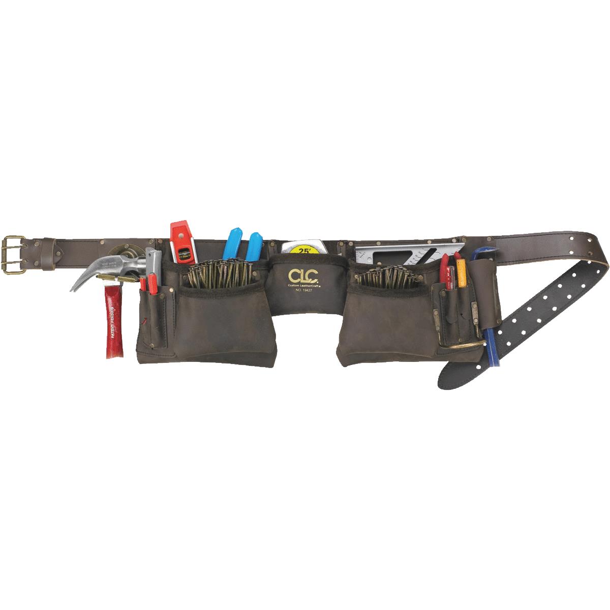 Oiled leather construction workers apron. Includes 4 main reversed nail and tool pockets. 6 smaller pockets for tools and pencils. 2″ leather belt. Fits waist sizes 29″ to 46″.