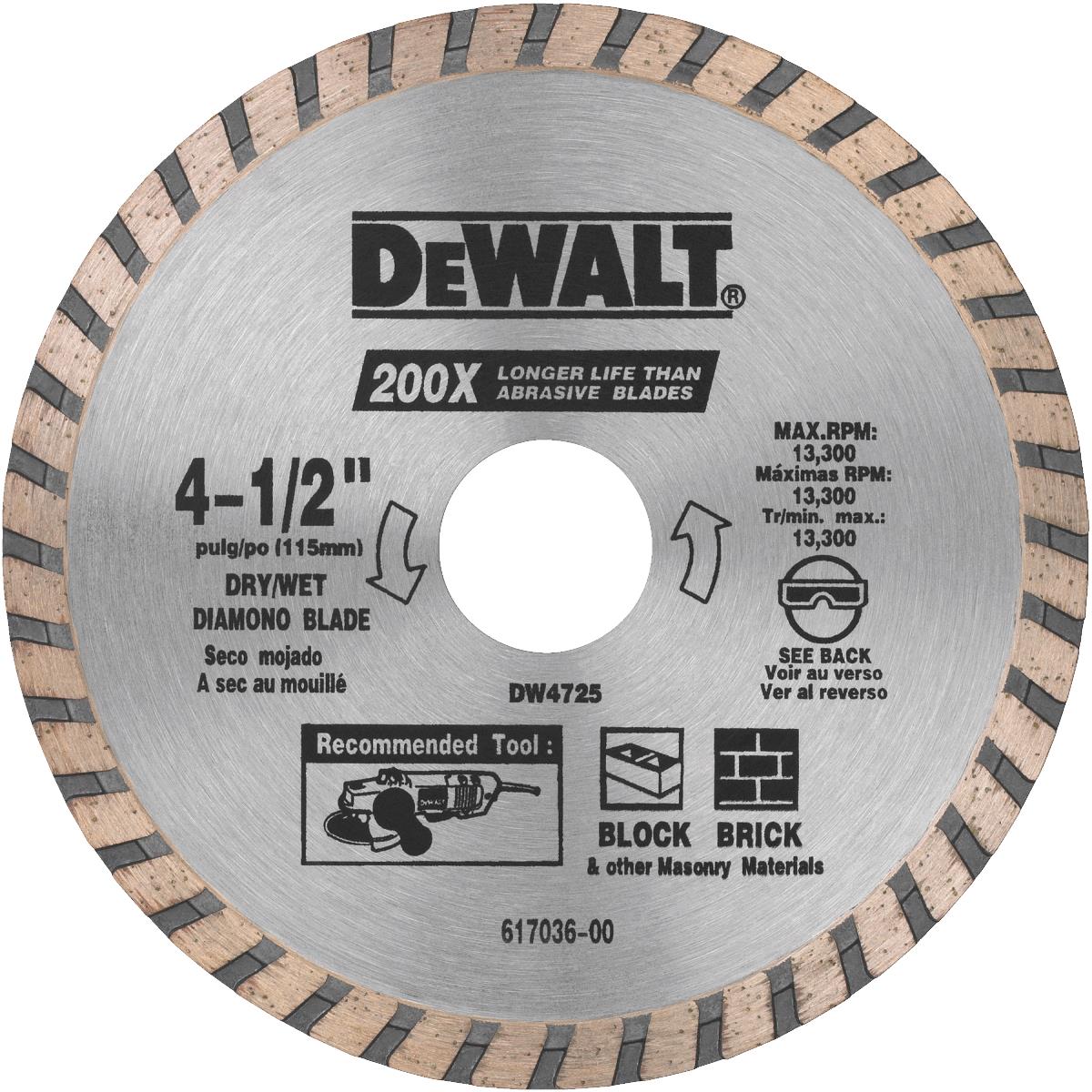 DeWalt High Performance diamond blades provide faster rate of cut at constant depth with 30 times the life of bonded abrasive blades. Thinner kerf to increase speed of cut while minimizing dust. For cutting concrete, brick, and other masonry material. No. DW4724: Blade Diameter: 4 In., Rim Type: Turbo, Dry/Wet Cut: Dry/Wet, Arbor Size: 5/8 In., 7/8 In., 20mm, Maximum Speed: 15,200 rpm, Edge Thickness: 0.080 In., Applications: Concrete/Masonry, For Use With: Angle Grinder, Pkg Qty: 1, Package Type: Card No. DW4725: Blade Diameter: 4-1/2 In., Rim Type: Turbo, Dry/Wet Cut: Dry/Wet, Arbor Size: 7/8 In., Maximum Speed: 13,300 rpm, Edge Thickness: 0.080 In., Applications: Concrete/Masonry, For Use With: Angle Grinder, Pkg Qty: 1, Package Type: Card No. DW4725B: Blade Diameter: 4-1/2 In., Rim Type: Turbo, Dry/Wet Cut: Dry/Wet, Arbor Size: 7/8 In., Maximum Speed: 13,300 rpm, Edge Thickness: 0.080 In., Applications: Concrete/Masonry, For Use With: Angle Grinder, Pkg Qty: 1 No. DW4712: Blade Diameter: 7 In., Rim Type: Turbo, Dry/Wet Cut: Dry/Wet, Arbor Size: 5/8 In. 7/8 In., Maximum Speed: 8700 rpm, Edge Thickness: 0.090 In., Applications: Concrete/Masonry, For Use With: Circular Saw, Pkg Qty: 1, Package Type: Card No. DW4712B: Blade Diameter: 7 In., Rim Type: Turbo, Dry/Wet Cut: Dry/Wet, Arbor Size: 5/8 In., 7/8 In., Maximum Speed: 8700 rpm, Edge Thickness: 0.090 In., Applications: Concrete/Masonry, For Use With: Circular Saw, Pkg Qty: 1. WARNING: Cancer and Reproductive Harm – www.P65Warnings.ca.gov