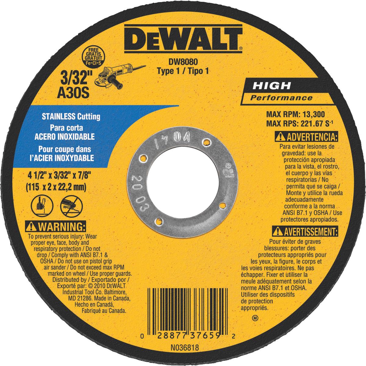 DEWALT HP Type 1 4-1/2 In. x 1/8 In. x 7/8 In. Stainless Cut-Off Wheel (DW8080)