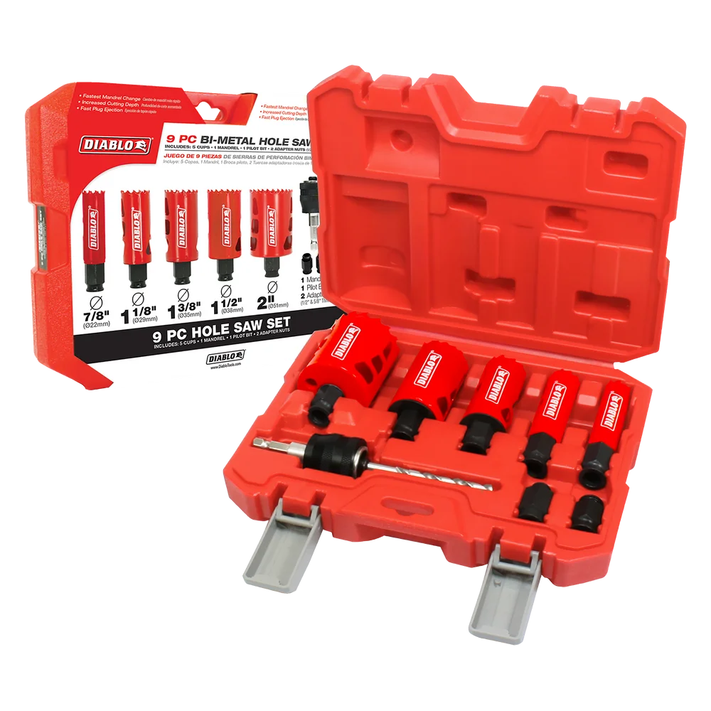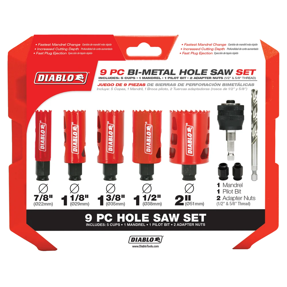 The Diablo 9-Piece Hole Saw Kit features five (5) bi-metal hole saw cups, 1 piece SnapLock PLUS mandrel, 1 pilot bit and 2 adaptor nuts (1/2” and 5/8”) for quick and easy hole saw cup changes for maximum job performance. This new, high performance hole saw set delivers faster cutting performance and increased productivity versus standard bi-metal hole saws. Unlike anything on the market, Diablo’s hole saws and SnapLock Plus mandrel system simplify the attachment process for fast and efficient hole saw mounting.