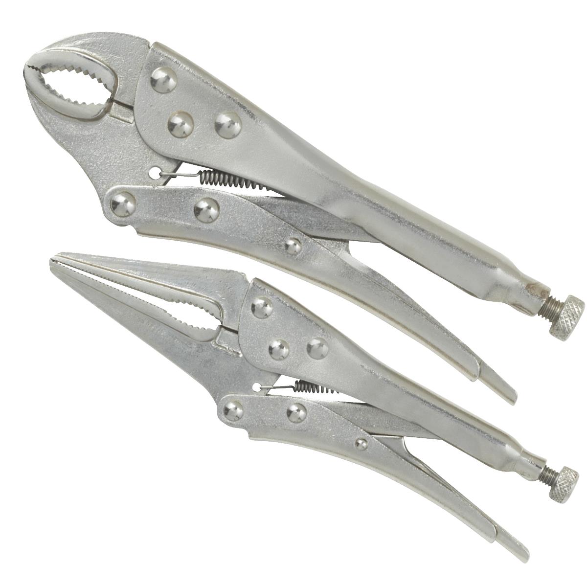 Economy priced hand tool set. Drop-forged jaws. Chrome-plated. Features quick-release lever. Set includes 6″ long nose and 7″ curved jaw locking pliers. No. 306320: Pieces In Set: 2 Pcs., Pkg Qty: 2, Package Type: Clamshell. WARNING: Cancer and Reproductive Harm – www.P65Warnings.ca.gov