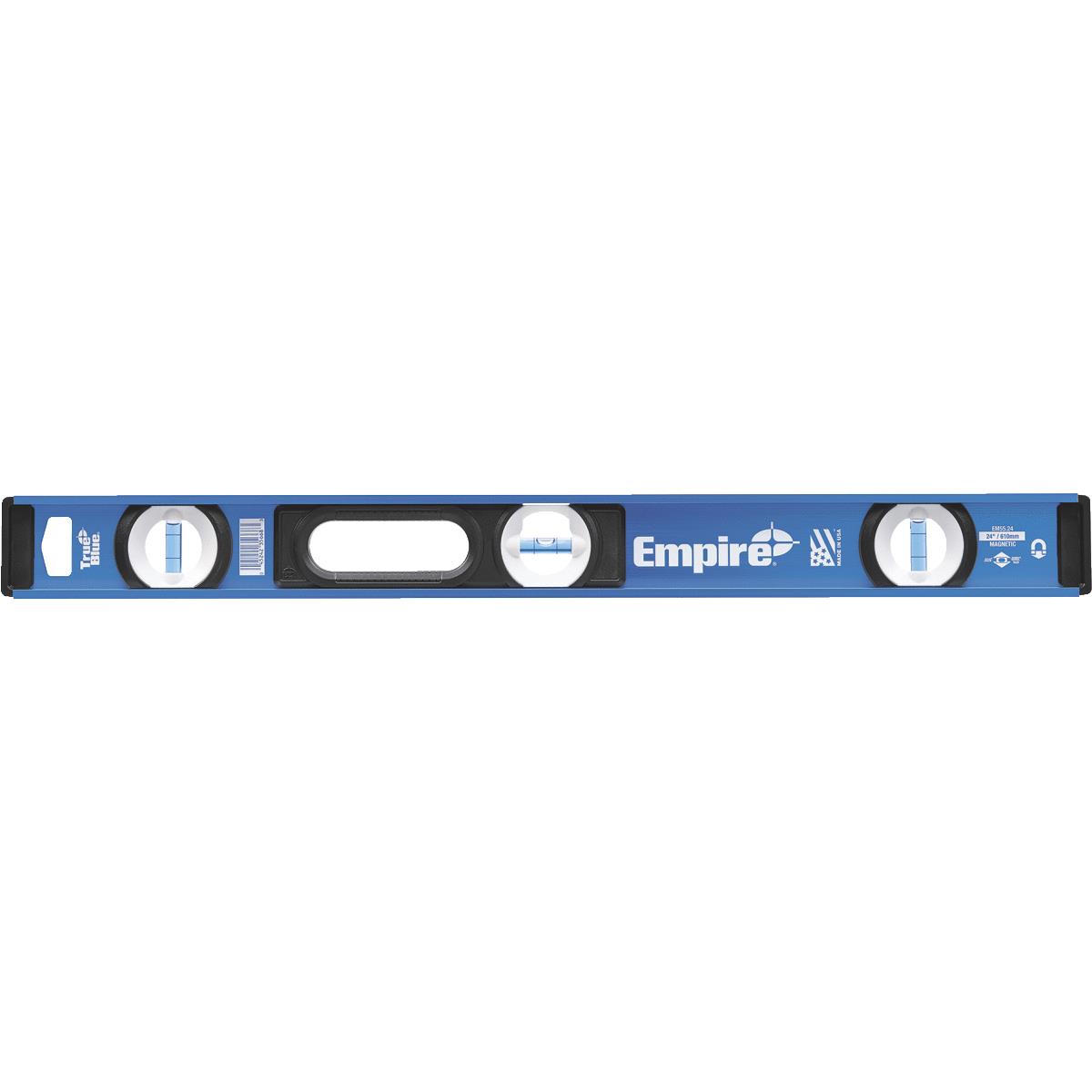 True Blue I-Beam level offers superior performance in all key areas of user needs and functionality. Exclusive high contrast vial surrounds make viewing easier in all light conditions. High impact acrylic e-Band vials for durability. Vials also include patented blue-bands to maximize bubble meniscus visibility and are accurate to within .0005 In. (inch) per inch in all working positions. All metal frame construction guarantees long-life accuracy and is equipped with impact-resistant end caps to withstand harsh job site conditions. Features top-read window for clear overhead viewing and built-in molded grip zones for enhanced portability. No. 500.24: Length: 24 In., Material: Aluminum, Magnetic: No, Number Of Vials: 3, Pkg Qty: 1 No. 500.48: Length: 48 In., Material: Aluminum, Magnetic: No, Number Of Vials: 3, Pkg Qty: 1 No. 500.72: Length: 72 In., Material: Aluminum, Magnetic: No, Number Of Vials: 3, Pkg Qty: 1 No. 500M.24: Length: 24 In., Material: Aluminum, Magnetic: Yes, Number Of Vials: 3, Pkg Qty: 1 No. 500M.48: Length: 48 In., Material: Aluminum, Magnetic: Yes, Number Of Vials: 3, Pkg Qty: 1 No. 500M.78: Length: 78 In., Material: Aluminum, Magnetic: Yes, Number Of Vials: 3, Pkg Qty: 1.