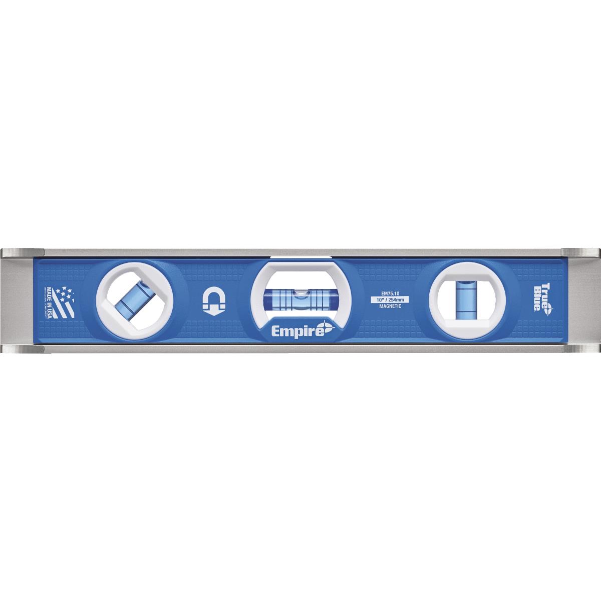 True Blue vials are accurate to within .0005 In. (inch) per inch in all working positions. Heavy-duty extruded aluminum frame with top read window. Three e-Band vials highlight the meniscus of the bubble to provide a clear reading at plumb and 45 Degrees, while the Dual-Pitch vial can read slope at 1/8 In. and 1/4 In. increments in either direction. Three powerful rare earth magnets for 15 Lb. (pound) of holding power. Features straight edge groove and wall grippers to allow users to extend the length of the level with any straight edge. No. EM75.10: Length: 10 In., Material: Aluminum, Magnetic: Yes, Number of Vials: 3, Pkg Qty: 1, Package Type: Card.