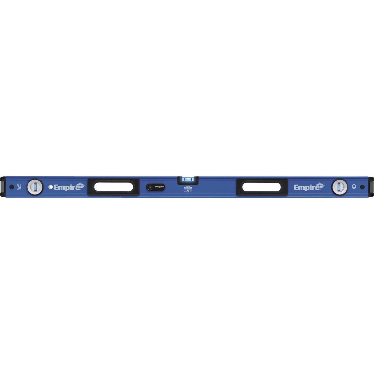 Concentrated surround dual LEDs (light emitting diode) provide superior vial visibility. UV (ultra-violet) activated optical brightener maximizes LED light intensity. High contrast e-Band vials highlight the edge of the bubble. Reinforced vial locking system secures acrylic block vials and delivers long life accuracy by resisting breaking, leaking or fogging. IP54 rating protects level from dust and water. Tool-free removable, shock absorbing end caps provide superior protection and scribing performance. Precision milled edges for guaranteed accuracy. Surface grippers prevent the level from sliding on angled surfaces. Powerful rare earth magnets provide superior holding strength. LEDs flash when battery is low. Automatic shut-off saves battery life by turning off LEDs after two minutes. Hang hole for ease of storage. Includes (2) AA batteries. No. EM95.24: Length: 24 In., Material: Aluminum, Magnetic: Yes, Number Of Vials: 3, Pkg Qty: 1, Package Type: Hang Tag No. EM95.48: Length: 48 In., Material: Aluminum, Magnetic: Yes, Number Of Vials: 3, Pkg Qty: 1, Package Type: Hang Tag.