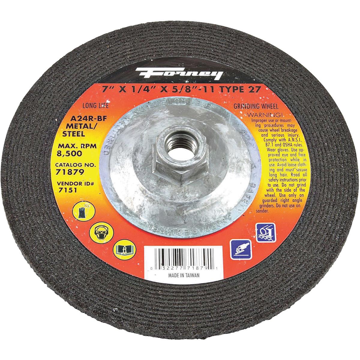 No. 71879: Diameter: 7 In., Thickness: 1/4 In., Arbor Size: 5/8 In.-11, Material Cut: Metal, Steel, Grit: A24R-BF, Maximum Speed: 8500 rpm, Machine Use: Angle Grinder, Pkg Qty: 1
