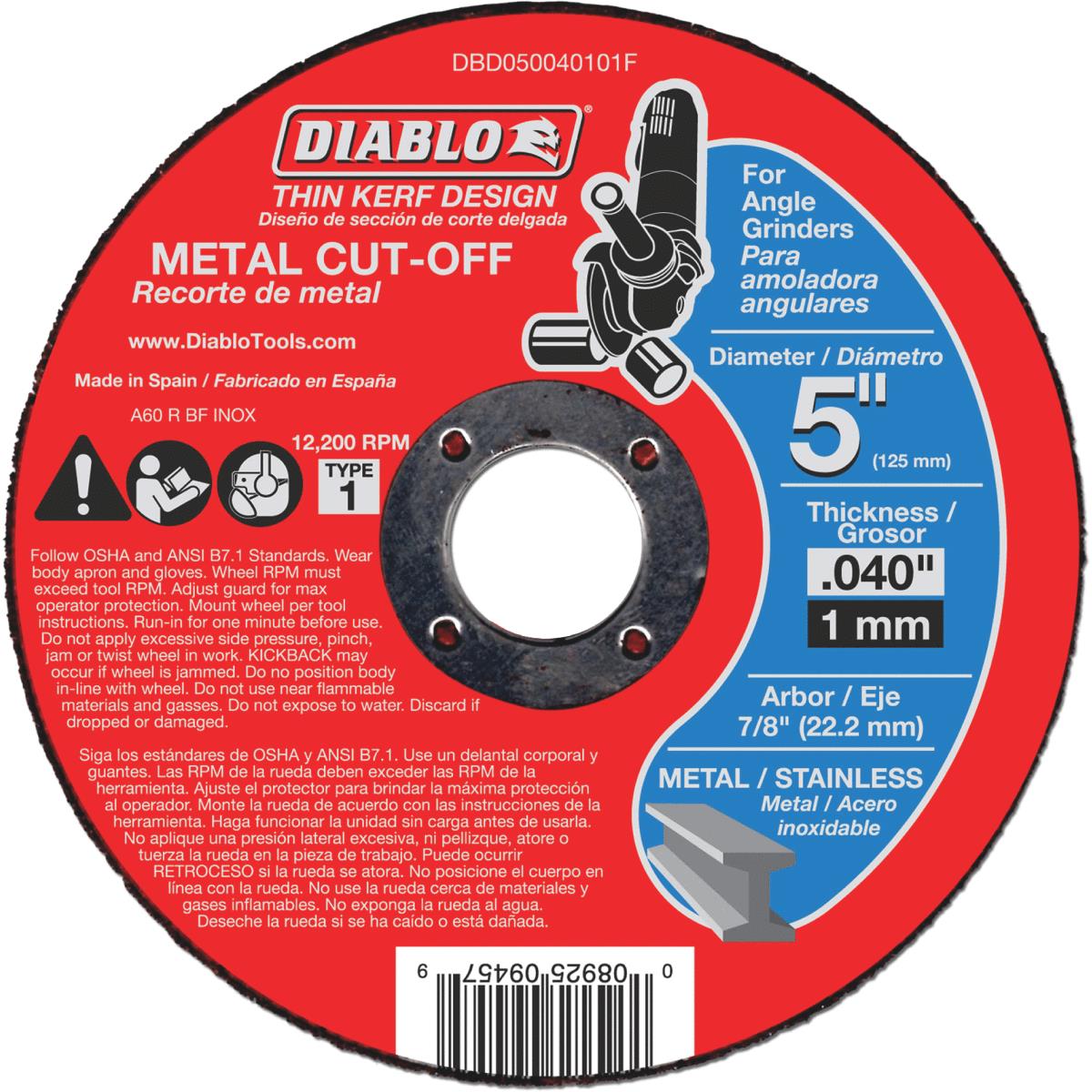 Diablo’s premium metal cut-off discs provide superior performance and increased productivity. Featuring a premium aluminum oxide blend, these discs cut through material faster than other cut-off discs and offer an extra long cutting life. Diablo’s thin kerf design provides for a thin, fast cut with minimal burr formation. Unlike other bonded discs on the market, this cut-off disc is a true .4 in. design. Fully reinforced for use in hand-held cut-off work. Ideal for use when working in hard to reach areas.