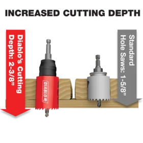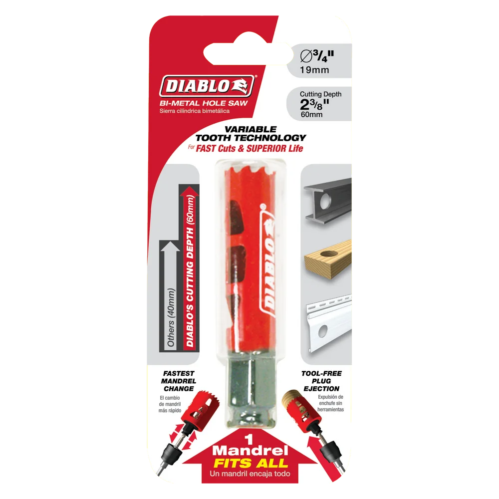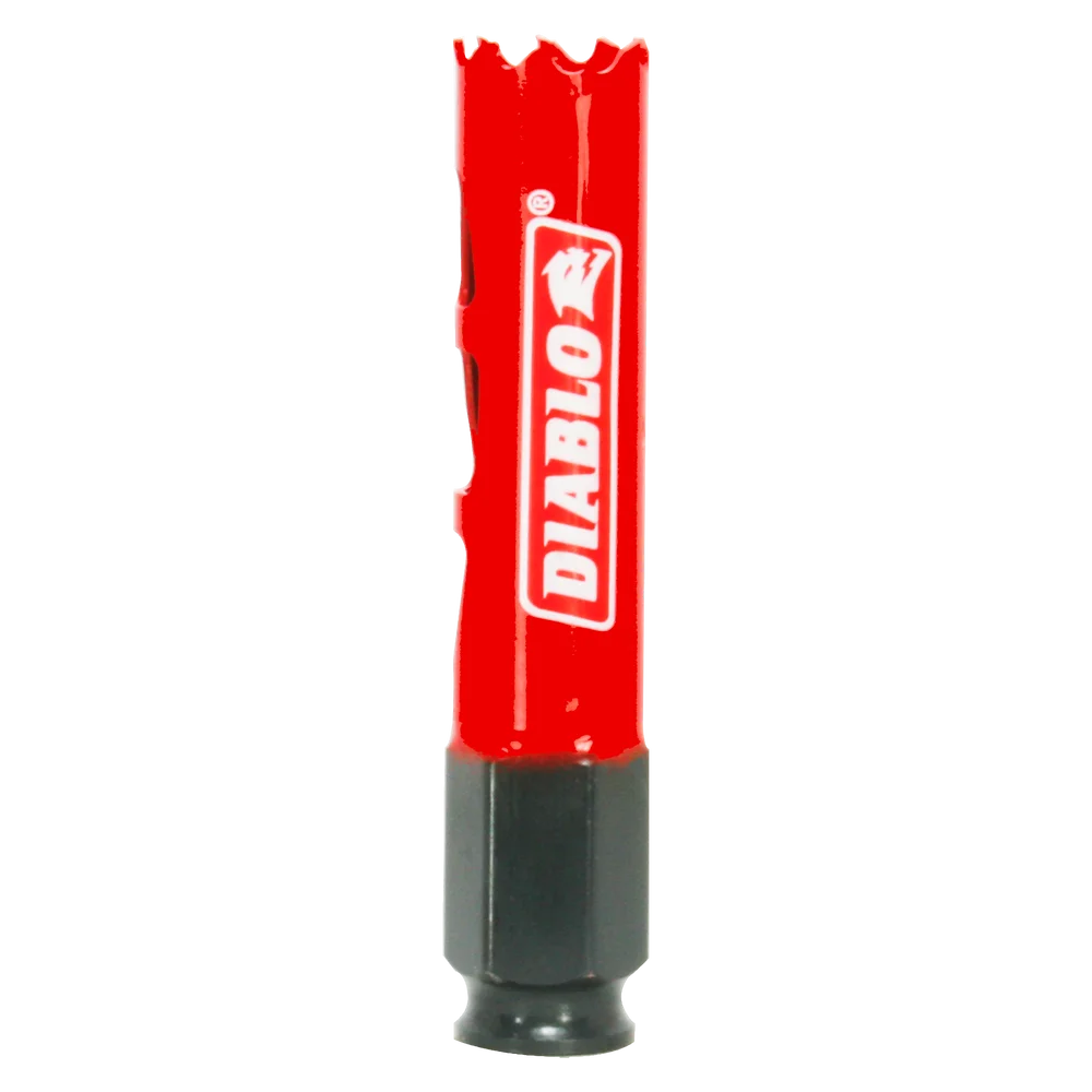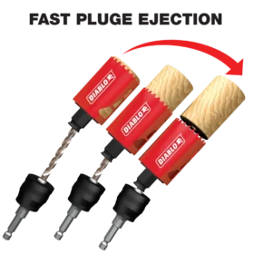 Diablo’s new, high performance hole saws deliver faster cutting performance and increased productivity. Unlike anything on the market, Diablo’s hole saw system and mandrel design simplify the attachment process for fast and efficient hole saw mounting. These radical new hole saws provide ultimate cutting length to bore deeper holes in a single pass, tool-free plug ejection and Variable Tooth Design for faster cuts. Mandrel and pilot bit sold separately.