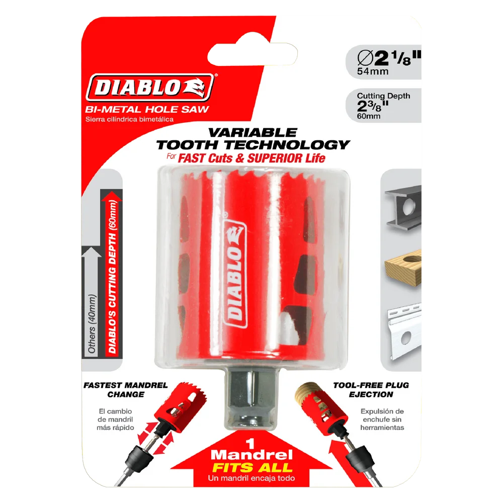 Diablo’s new, high performance hole saws deliver faster cutting performance and increased productivity. Unlike anything on the market, Diablo’s hole saw system and mandrel design simplify the attachment process for fast and efficient hole saw mounting. These radical new hole saws provide ultimate cutting length to bore deeper holes in a single pass, tool-free plug ejection and Variable Tooth Design for faster cuts.