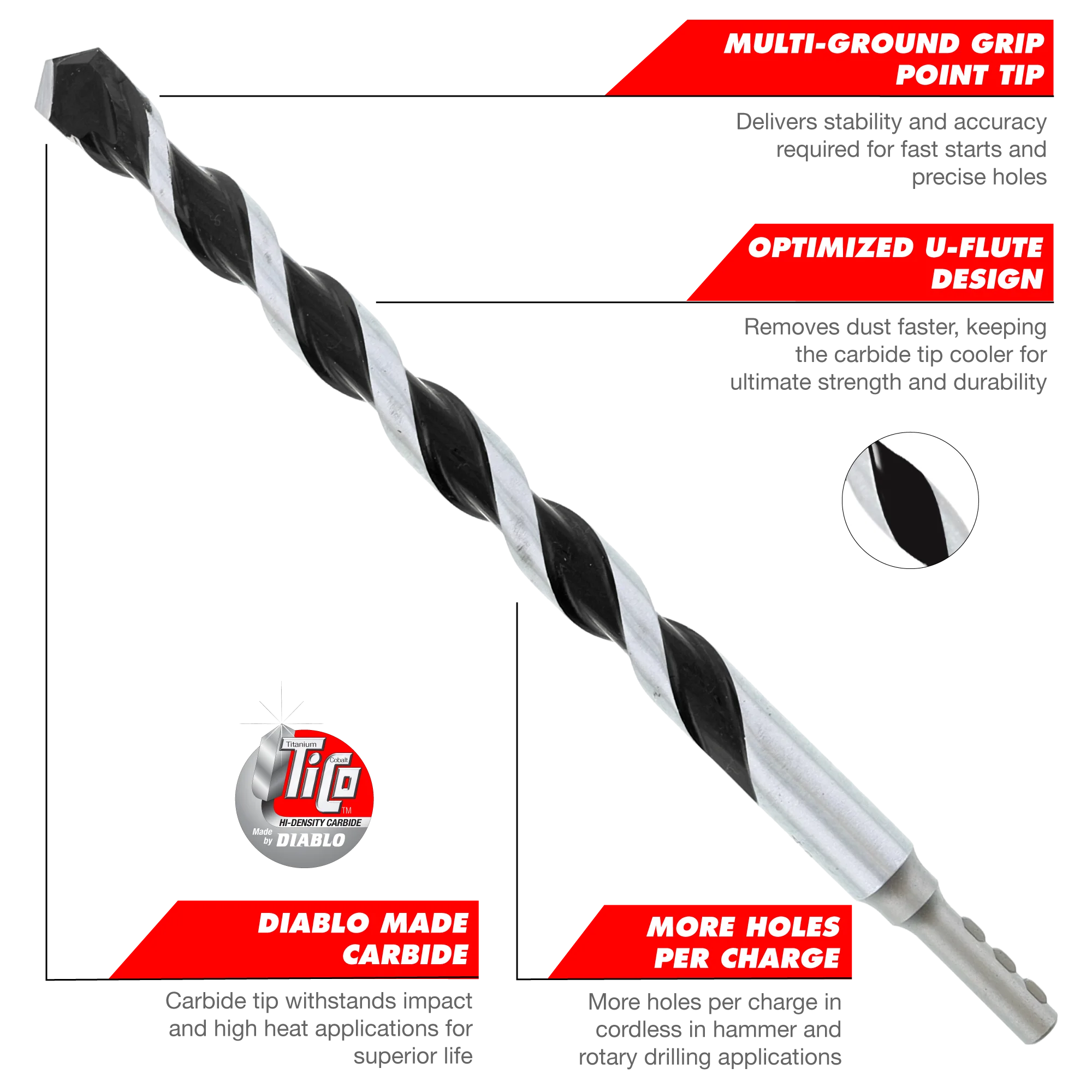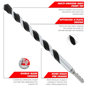 - Diablo made carbide tip withstands impact and high heat applications for superior life versus standard multi-purpose hammer drill bits
