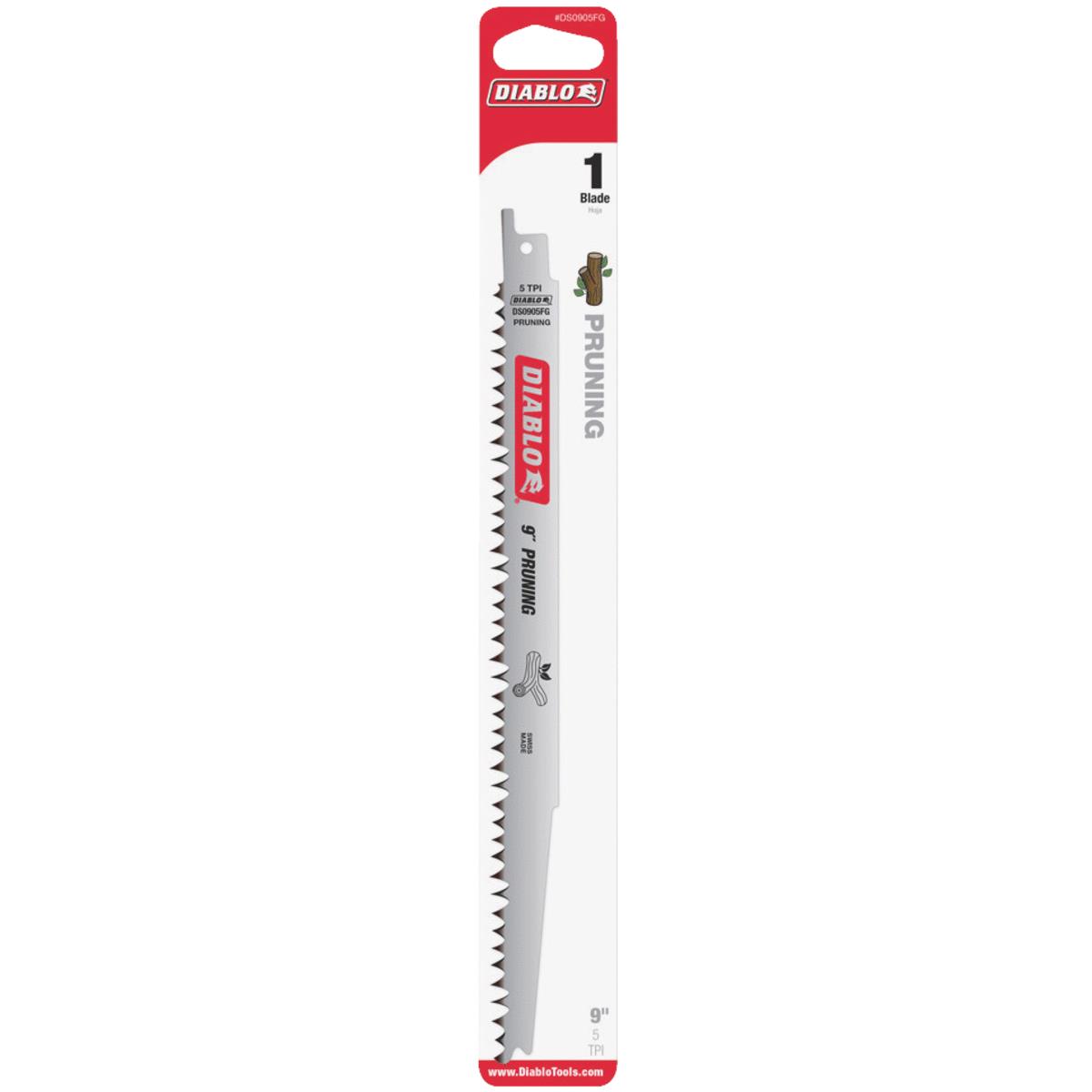 Diablo fleam ground reciprocating saw blades provide the best pruning/cutting performance. Bi-directional tooth design allows for fast and smooth cutting in both directions. Tip design enables faster, easier plunging and hardened cutting edge provides long cutting life. Ideal for pruning wood, including pressure-treated wood. Not recommended for cutting wood with nails. No. DS0905FG: Length: 9 In., Teeth Per Inch: 5 TPI, Type: Pruning, Material: Bi-Metal, Application: Wet, Green Wood, Pkg Qty: 1, Package Type: Card No. DS0905FG5: Length: 9 In., Teeth Per Inch: 5 TPI, Type: Pruning, Material: Bi-Metal, Application: Wet, Green Wood, Pkg Qty: 5, Package Type: Clamshell No. DS1205FG: Length: 12 In., Teeth Per Inch: 5 TPI, Type: Pruning, Material: Bi-Metal, Application: Wet, Green Wood, Pkg Qty: 1, Package Type: Card No. DS1205FG5: Length: 12 In., Teeth Per Inch: 5 TPI, Type: Pruning, Material: Bi-Metal, Application: Wet, Green Wood, Pkg Qty: 5, Package Type: Clamshell.