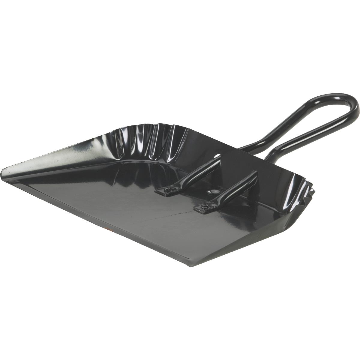 Jumbo black metal dust pan. Rugged metal construction, 16″ width and 9″ handle. This dust pan will lay flat on floors for easy debris pickup from angle broom, corn broom, or push broom. No. H495: Width: 16″, Color: Black, Material: Metal, Pkg Qty: 1.