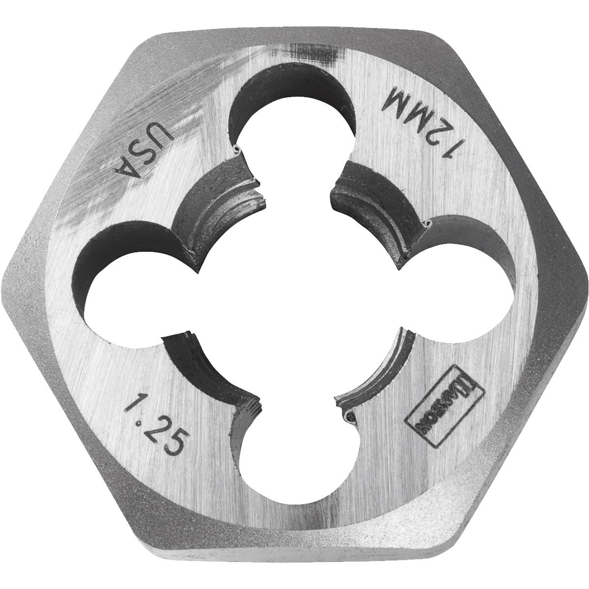 High-carbon steel hexagon metric dies. Ideal for automotive repair and machinery. Ideal for pipe fittings. For use in areas with limited space. No. 9717: Thread Size: 4 mm – 0.70, Die Width: 1″, Pkg Qty: 1, Package Type: Card No. 9722ZR: Thread Size: 5 mm – 0.80, Die Width: 1″, Pkg Qty: 1, Package Type: Card No. 9727ZR: Thread Size: 6 mm – 1.0, Die Width: 1″, Pkg Qty: 1, Package Type: Card No. 9733: Thread Size: 8 mm – 1.0, Die Width: 1″, Pkg Qty: 1, Package Type: Card No. 9734: Thread Size: 8 mm – 1.25, Die Width: 1″, Pkg Qty: 1, Package Type: Card No. 9738: Thread Size: 10 mm -1.0, Die Width: 1″, Pkg Qty: 1, Package Type: Card No. 9739: Thread Size: 10 mm – 1.25, Die Width: 1″, Pkg Qty: 1, Package Type: Card No. 9740: Thread Size: 10 mm – 1.5, Die Width: 1″, Pkg Qty: 1, Package Type: Card No. 9742: Thread Size: 12 mm – 1.25, Die Width: 1″, Pkg Qty: 1, Package Type: Card No. 9743: Thread Size: 12 mm – 1.5, Die Width: 1″, Pkg Qty: 1, Package Type: Card.