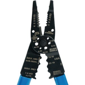 Handles wide range of sizes and functions: Wire cutting, bolt cutting, wire stripping, and crimping including 7 to 8mm ignition terminals. Cutters and strippers are located in nose to reach in tight places. Crimping dies for insulated and noninsulated connectors from 10 to 22-gauge and cutters for 4-40, 5-40, 6-32, 8-32, 10-32, and 10-24 bolts. Narrow, serrated pliers jaws. Plastic covered handles. Overall length 8-1/4″.