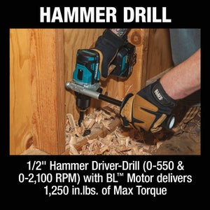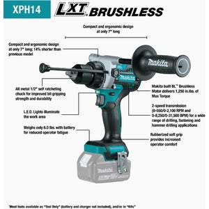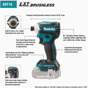 - Includes (1) hammer drill/driver (XPH14Z), (1) 4-speed impact driver (XDT16Z), (2) 18V LXT 5.0 Ah batteries, (1) battery charger, and (1) tool bag