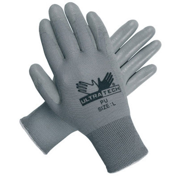 UltraTech PU Coated Gloves, Large, Gray. Ultra Tech Gray nylon palm. 13 gauge. Great tactile sensitivity. Super comfort and fit. Excellent grip. Greater dexterity. Abrasion resistance. Coating=Polyurethane. Color=Gray. Cuff Style=Knit-Wrist. Lining=100% Nylon. Material=100% Nylon. Size Group=Large. Style=Palm and Fingertip Coated. Wt.=0.07 lb. WARNING: Cancer and Reproductive Harm – www.P65Warnings.ca.gov.