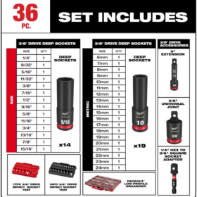 Kit includes 30 Deep SAE & Metric Sockets and 1 Impact Socket Accessory . The following sizes are included: “,3/8″, 7/16″ 1/2, 9/16, 5/8, 11/16, 3/4, 13/16, 7/8, 15/16, 1″, 1-1/16″, 1-1/8″, 1-1/4″, 1-1/2″, 10mm, 11mm, 12mm, 13mm, 14mm, 15mm, 16mm, 17mm, 18mm, 19mm, 20mm, 21mm, 22mm, 23mm, 24mm, 3” Extension