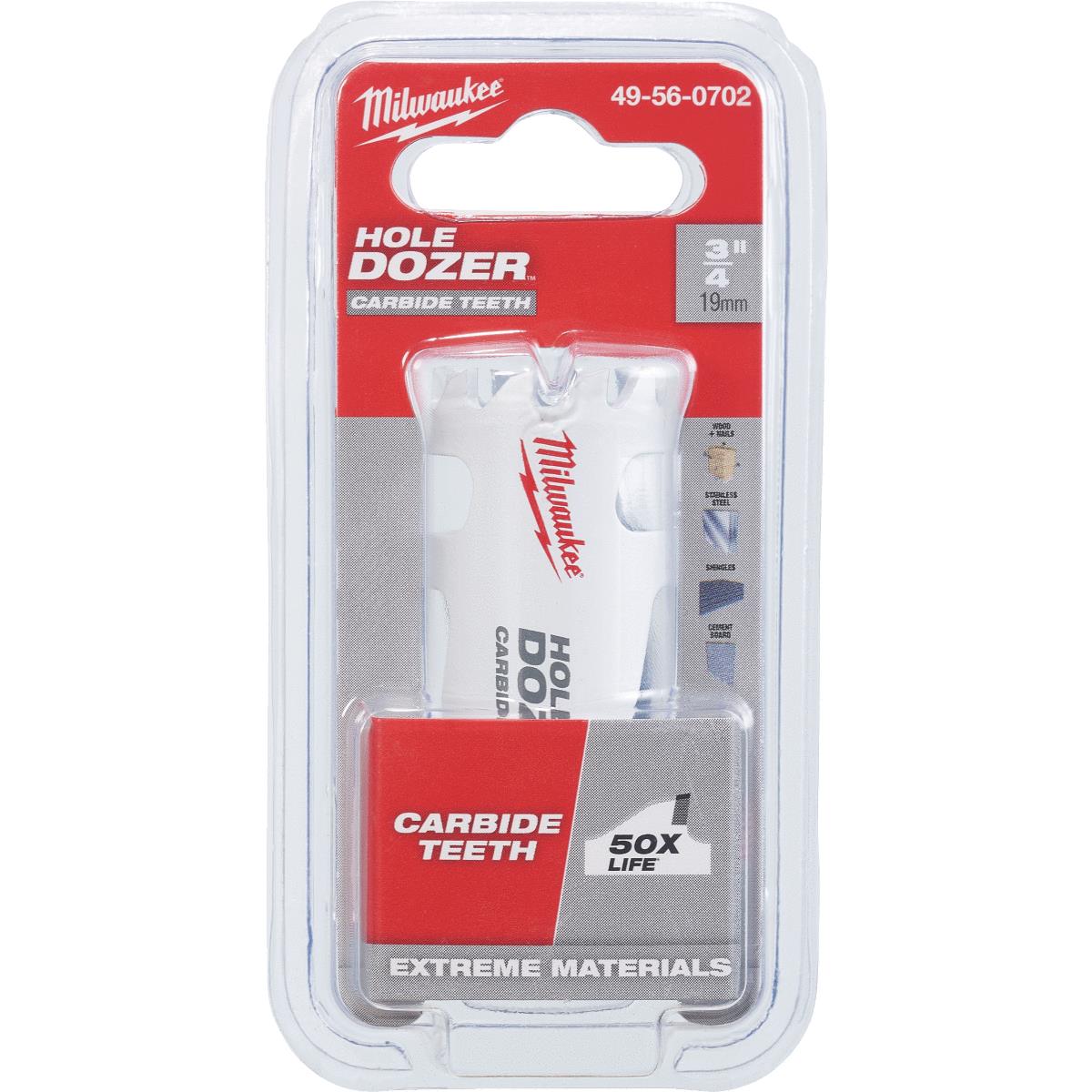 Milwaukee Hole Dozer with carbide teeth hole saws provide 50 times life in extreme multi-material cutting applications when compared to bi-metal hole saws while cutting in high rpm (revolutions per minute). Built utilizing a tough carbide grade combined with a durable 4 TPI (teeth per inch) design, yielding the best tooth durability and longest life in stainless steel, abrasive materials and fastener embedded wood. Cutting depth is 1.62 In., allowing clearance to handle cuts in all materials. With a thermoset coating to reduce friction and drag during cutting, users benefit from faster cutting and increased cordless efficiency. Slug removal is made easy with the plug jack T-Slots. Plug jack enhanced user productivity by providing best access and leverage to remove material slugs. No. 49-56-0702: Diameter: 3/4 In., Material: Carbide, Cutting Depth: 1-5/8 In., Pkg Qty: 1, Package Type: Clamshell No. 49-56-0704: Diameter: 7/8 In., Material: Carbide, Cutting Depth: 1-5/8 In., Pkg Qty: 1, Package Type: Clamshell No. 49-56-0707: Diameter: 1 In., Material: Carbide, Cutting Depth: 1-5/8 In., Pkg Qty: 1, Package Type: Clamshell No. 49-56-0708: Diameter: 1-1/8 In., Material: Carbide, Cutting Depth: 1-5/8 In., Pkg Qty: 1, Package Type: Clamshell No. 49-56-0710: Diameter: 1-1/4 In., Material: Carbide, Cutting Depth: 1-5/8 In., Pkg Qty: 1, Package Type: Clamshell No. 49-56-0712: Diameter: 1-3/8 In., Material: Carbide, Cutting Depth: 1-5/8 In., Pkg Qty: 1, Package Type: Clamshell No. 49-56-0713: Diameter: 1-1/2 In., Material: Carbide, Cutting Depth: 1-5/8 In., Pkg Qty: 1, Package Type: Clamshell No. 49-56-0717: Diameter: 1-3/4 In., Material: Carbide, Cutting Depth: 1-5/8 In., Pkg Qty: 1, Package Type: Clamshell No. 49-56-0719: Diameter: 1-7/8 In., Material: Carbide, Cutting Depth: 1-5/8 In., Pkg Qty: 1, Package Type: Clamshell No. 49-56-0720: Diameter: 2 In., Material: Carbide, Cutting Depth: 1-5/8 In., Pkg Qty: 1, Package Type: Clamshell No. 49-56-0724: Diameter: 2-1/4 In., Material: Carbide, Cutting Depth: 1-5/8 In., Pkg Qty: 1, Package Type: Clamshell No. 49-56-0726: Diameter: 2-3/8 In., Material: Carbide, Cutting Depth: 1-5/8 In., Pkg Qty: 1, Package Type: Clamshell No. 49-56-0727: Diameter: 2-1/2 In., Material: Carbide, Cutting Depth: 1-5/8 In., Pkg Qty: 1, Package Type: Clamshell No. 49-56-0729: Diameter: 2-5/8 In., Material: Carbide, Cutting Depth: 1-5/8 In., Pkg Qty: 1, Package Type: Clamshell No. 49-56-0734: Diameter: 3 In., Material: Carbide, Cutting Depth: 1-5/8 In., Pkg Qty: 1, Package Type: Clamshell No. 49-56-0738: Diameter: 3-1/2 In., Material: Carbide, Cutting Depth: 1-5/8 In., Pkg Qty: 1, Package Type: Clamshell No. 49-56-0739: Diameter: 3-5/8 In., Material: Carbide, Cutting Depth: 1-5/8 In., Pkg Qty: 1, Package Type: Clamshell No. 49-56-0742: Diameter: 4 In., Material: Carbide, Cutting Depth: 1-5/8 In., Pkg Qty: 1, Package Type: Clamshell No. 49-56-0744: Diameter: 4-1/4 In., Material: Carbide, Cutting Depth: 1-5/8 In., Pkg Qty: 1, Package Type: Clamshell No. 49-56-0746: Diameter: 4-1/2 In., Material: Carbide, Cutting Depth: 1-5/8 In., Pkg Qty: 1, Package Type: Clamshell.