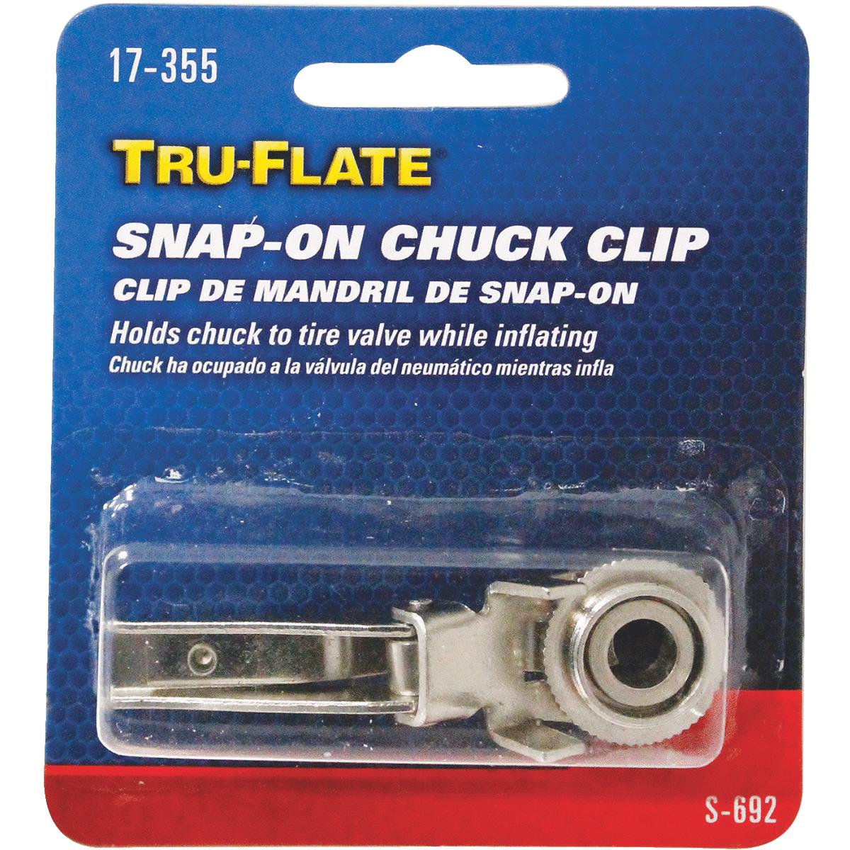 Snap-on chuck clip converts any single foot chuck to a clip-on chuck. Holds chuck to tire valve while inflating. Fits all standard ball foot chucks with .672-32 thread.