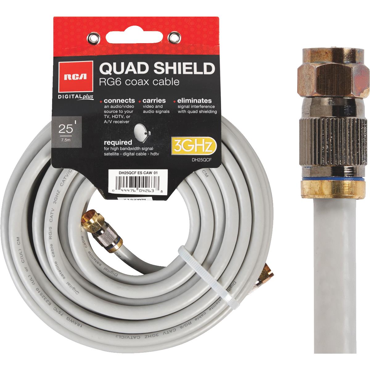 The Digital Plus quad RG6 coaxial cable is a quality digital cable that connects any antenna, PVR, VCR, HDTV, cable box, or satellite receiver. Carries both audio and video signals for accurate signal transfer even over long runs. There are 4 shields around the cable to protect the integrity of the signal. Gold-plated conductors provide minimum resistance for clean signal transfer. Connects antenna, PVR, satellite, cable, HDTV converter, HDTV, or TV. Gold-plated conductors provides minimum resistance for clean signal transfer. No. DH25QCF: Length: 25 Ft., Color: Gray, Type: Quad RG6 Coaxial Cable, Pkg Qty: 1, Package Type: Sleeve.
