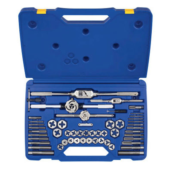 53-pc Machine Screw / Fractional Tap & Hex Die Set. Designed to ensure that bolts fit tightly and anchor securely.. Plug taps have 3 to 5 chamfered threads and are for general purpose applications.. 4-flute design ensures fast, easy chip clearance.. Hex head shape is designed for use in die stock and adjustable wrenches.. Die Type=Hexagon. Includes=53-pc set in plastic case includes the following items: Machine Screw Plug Tap and 1 in Hexagon Die in sizes: 6 – 32 NC; 8 – 32 NC; 10 – 24 NC; 10 – 32 NF; 12 – 24 NC Fractional Plug Tap and 1 in Hexagon Dies in sizes: 1/4 in – 20 NC; 1/4 in – 28 NF; 5/16 in – 18 NC; 5/16 in – 24 NF; 3/8 in – 16 NC; 3/8 in – 24 NF; 7/16 in – 14 NC; 7/16 in – 20 NF; 1/2 in – 13 NC; 1/2 in – 20 NF Fractional Plug Tap and 1-7/16 in Hexagon Dies in sizes: 9/16 in – 12 NC; 9/16 in – 18 NF; 5/8 in – 11 NC; 5/8 in – 18 NF; 3/4 in – 10 NC; 3/4 in – 16 NF Pipe Thread Plug Tap and 1 in Hexagon Dies in sizes: 1/8 in – 27 NPT; 1/4 in – 18 NPT Threading Tools: Adjustable Die Stock – 1 in Dies; Adjustable Die Stock – 1-7/16 in Dies; T-Handle Wrench – Taps No. 0 to 1/4 in; Adj. Handle Tap Wrench – Taps No. 0 to 1/2 in; Adj. Handle Tap Wrench – Taps No. 1/4 in to 1 in; 18 Leaf Standard Thread Pitch Gauge. Material=High Carbon Steel. Quantity=53 per case. Tap Type=Plug. Wt.=11.42 lb. WARNING: Cancer and Reproductive Harm – www.P65Warnings.ca.gov.