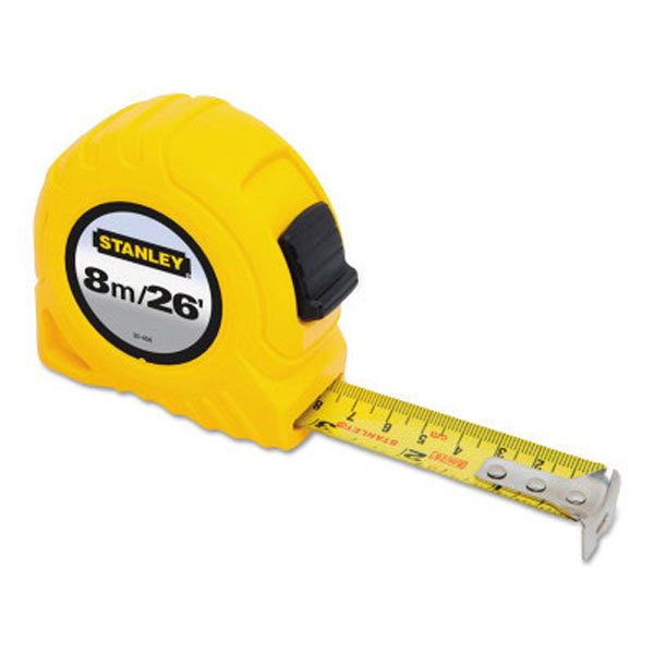 Tape Rules, 1 in x 8m/26 ft. 7′ standout. Polymer-coated blade for long life. Durable textured case for a non-slip grip. High-contrast colors for easy readability. Blade Finish=Polymer Coated. Blade Length [Nom]=8m/26 ft. Blade Material=Steel. Blade Width [Nom]=1 in. Case Material=ABS. Color=Yellow. End Type=Hook. Finish=High-Impact ABS. Graduation(s)=1/16 in. Material=High-Impact ABS; Steel. Measuring System=Inch/Metric. No. of Scales=2. Quantity=6 per box. Reel Type=Closed Reel. Return Motion=Spring. Stud Markings=16 in; 19.2 in. Type=Single Side Tape. Wt.=0.93 lb. .