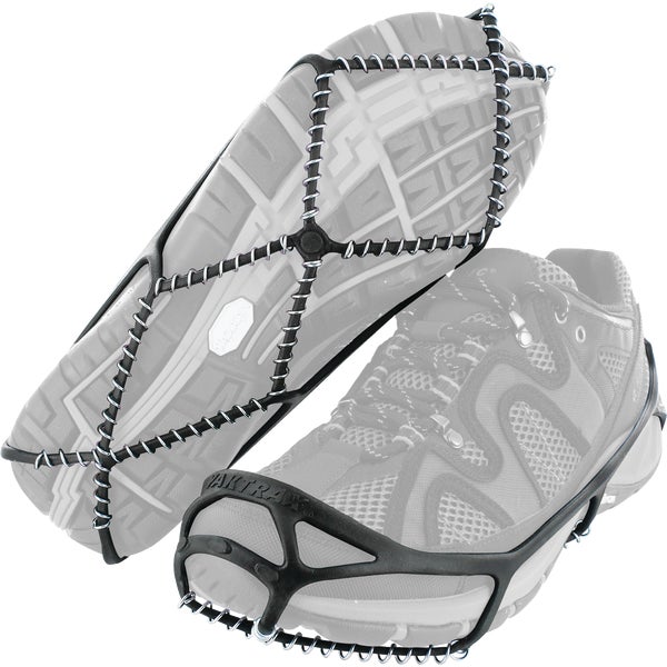 Yaktrax Pro is designed for those with a more active lifestyle. Designed for traction and safety while walking, jogging, or running on packed snow or ice. Makes it possible to enjoy outdoor activities or continue athletic training with the same stability as on dry surfaces. Provides 360 degrees of traction. Spikeless, ultra-lightweight design, built to last. Constructed of 1.4mm high-strength, shaped edge steel coils that are abrasion resistant and contain 70% recycled content with natural rubber webbing. Brittle-resistant to -41 degrees Fahrenheit. Material has no memory, returns to original shape when removed from footwear. Elasticity of material ensures ease of use when attaching to shoes.